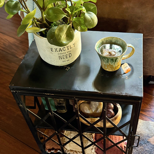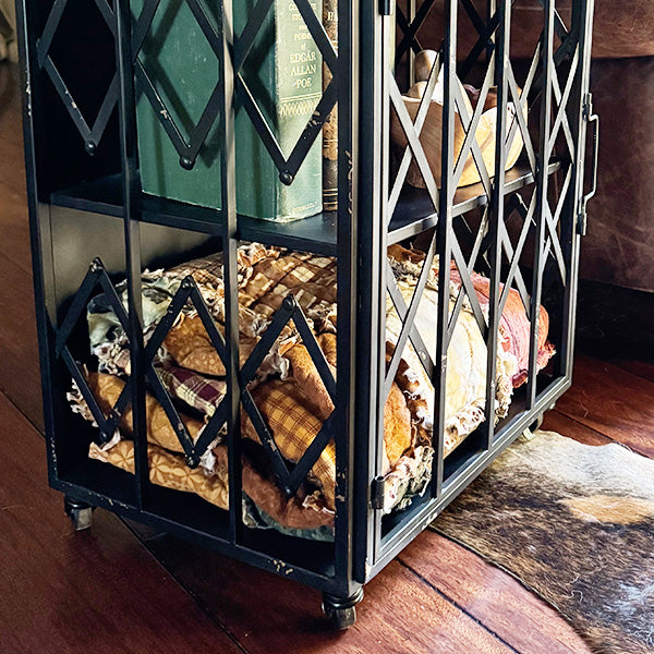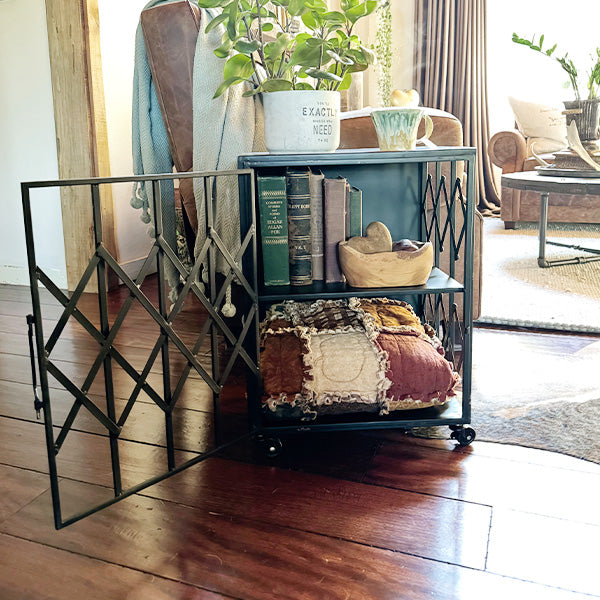 Our Rolling Industrial Accordion Metal Shelf Cabinet is where grit meets grace. Think vintage factory doors reimagined as furniture art. The distressed black metal? It tells stories—of old workshops, of tools and time, of design that earned its character. Then those accordion-style lattice doors… oh yes. They fold, they slide, they perform. Each movement feels like unveiling a secret—functional art at its best.