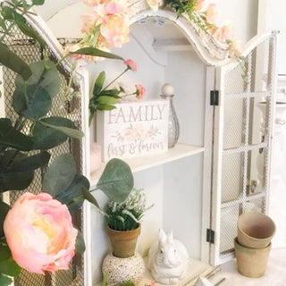 If you are like us (vintage connoisseurs) you will truly appreciate this distressed piece! We are absolutely in LOVE with the large size, hand-distressed, white paint finish, architectural design, the shape of the windows, and of course the vintage-inspired wire screen. These seemingly old cabinets are classic beauties that will look stunning lined with photos, old books, flowers, plants, or even all of the above! Or try mounting this wall shelf in your bathroom or kitchen to create more space. They are the perfect spot for rolled hand towels or other bathroom and kitchen essentials.