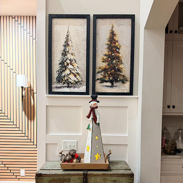 Classic snowman face with coal buttons and carrot nose tops the geometric body. Black top hat and burgundy scarf add traditional charm with rich color contrast. Dimensional metal Christmas tree accent completes one side.