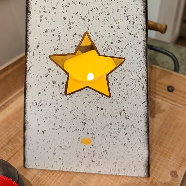 Distressed white and gray metal with authentic aged patina that feels antique-market discovered, not mass-produced. Star-shaped cutouts showcase the included LED candle—creating ambient glow that transforms from daytime decor to evening ambiance.