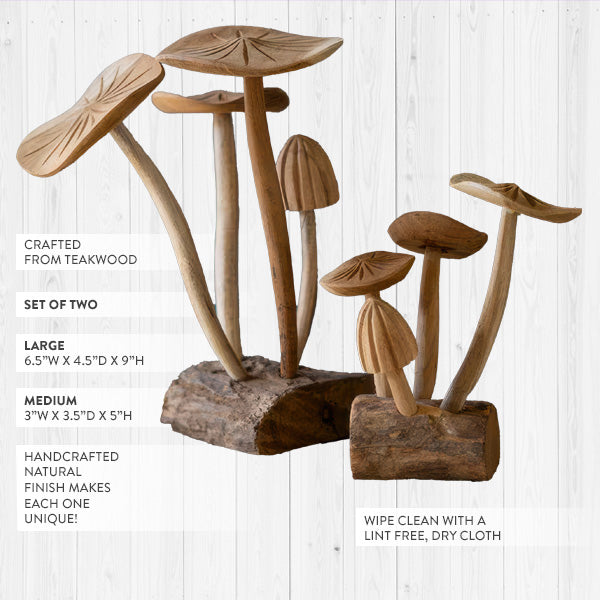 Each sculpture is hand-carved from genuine teakwood by skilled artisans. Look closely at those caps—the intricate radial lines are carved by hand, mimicking real mushroom gills with stunning detail.
