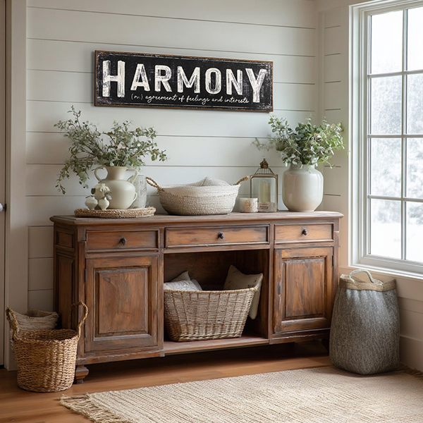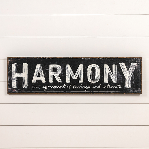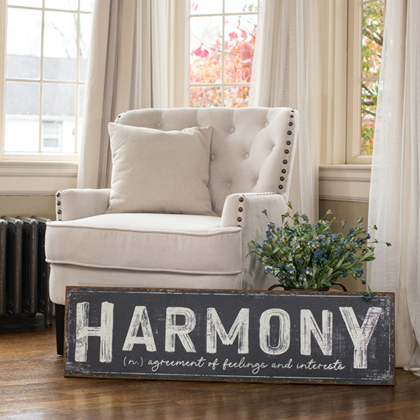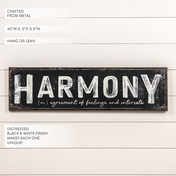 Sometimes the best design is the simplest—and this oversized metal sign proves it. Featuring the word “HARMONY” in bold vintage lettering, it’s paired with a charming script definition underneath: “agreement of feelings and interests.” A meaningful message that instantly sets a calm, welcoming tone in your home.