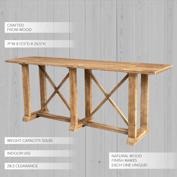 Crafted from sturdy fir wood with a natural finish, this beauty features that timeless X-frame base we all SWOON over. At over 70" long, it’s the perfect size to anchor your entryway, living room, or dining space with style. Whether you’re styling it with stacked books, baskets, or seasonal décor, its clean lines and rustic charm make it endlessly versatile.