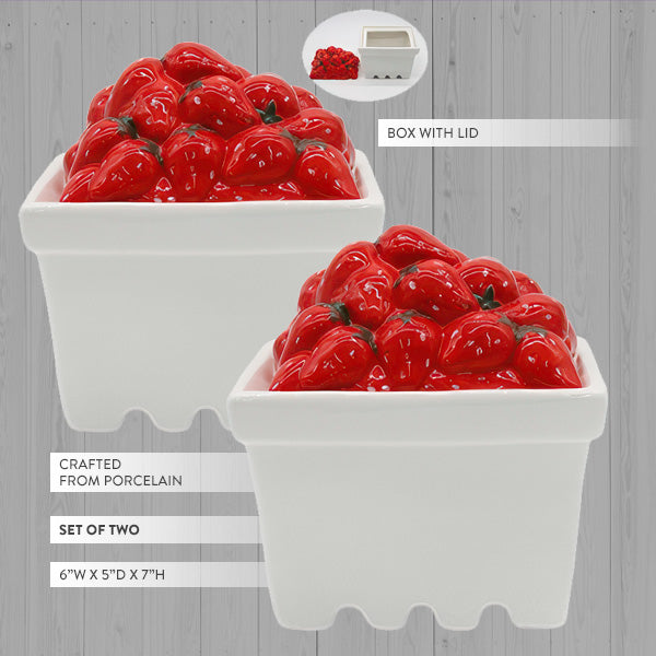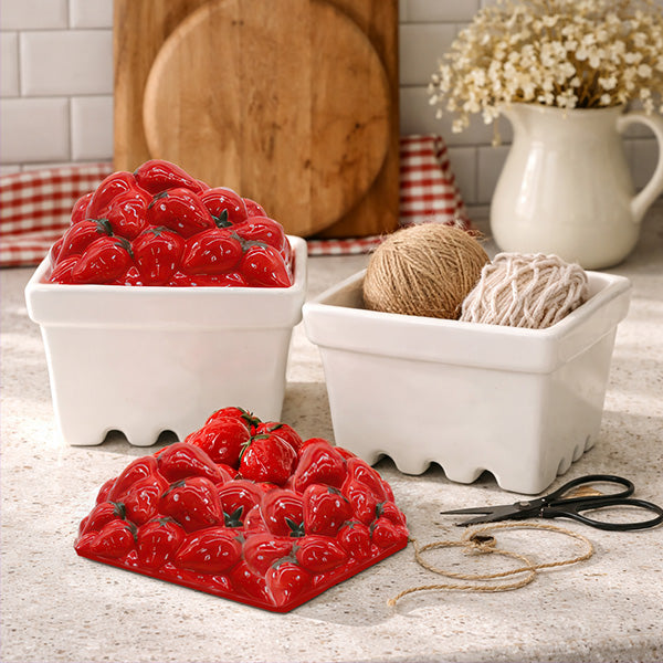 Remember picking strawberries as a kid — filling up those little paper cartons at the farm stand, the smell of summer on your hands? This is that memory, captured in porcelain and sitting pretty on your countertop. Two glossy white berry basket boxes, each topped with a lid sculpted to look like a heaping pile of fresh-picked strawberries. Equal parts nostalgic and ridiculously charming.