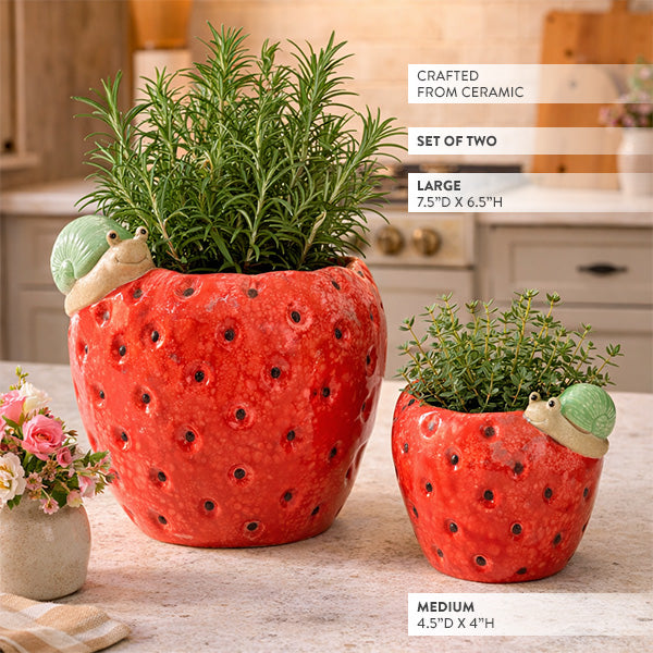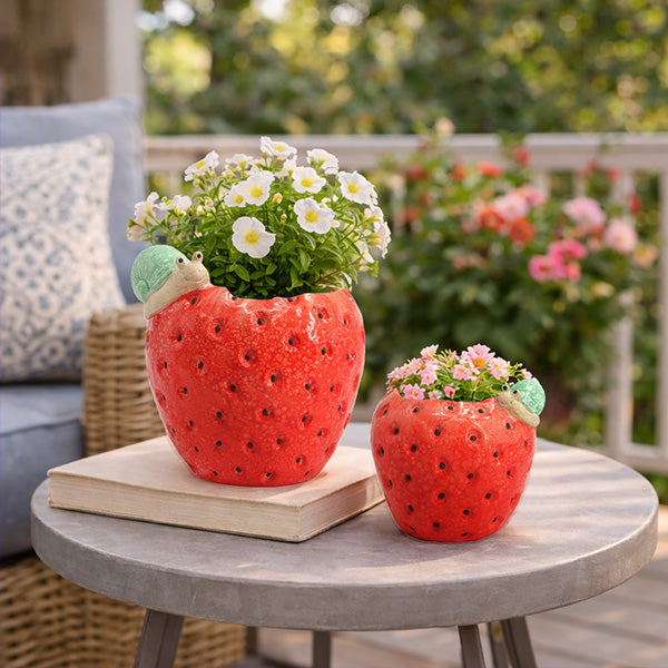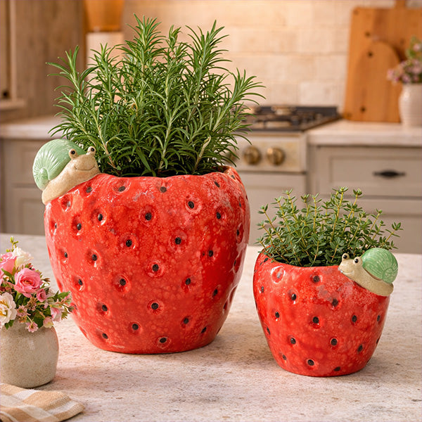 You know that moment when a guest spots something on your porch and completely loses their train of thought? That's what these do. Two glossy ceramic strawberry planters — one large, one medium — each with a little snail peeking over the rim like he owns the place. It's the kind of whimsical detail that makes a space feel curated rather than just decorated.