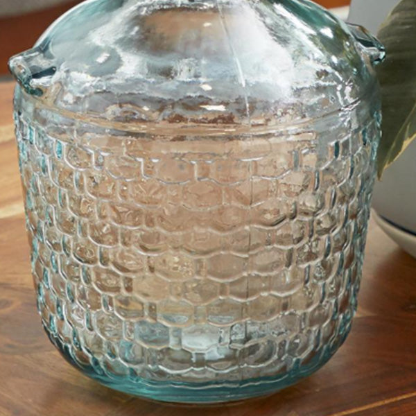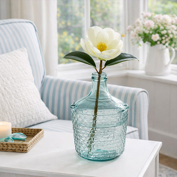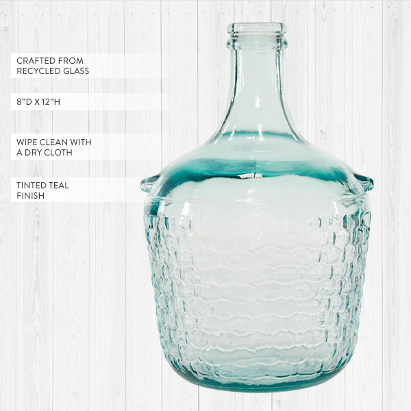 This recycled glass demijohn has the kind of shape that stops people mid-conversation — that classic bulbous silhouette, a honeycomb-textured lower half that catches and refracts light, and a soft teal tint that feels equally at home in a coastal cottage or a modern farmhouse living room. At 8" wide and 12" tall, it's substantial enough to anchor a coffee table, a bookshelf, or an entryway console all on its own.