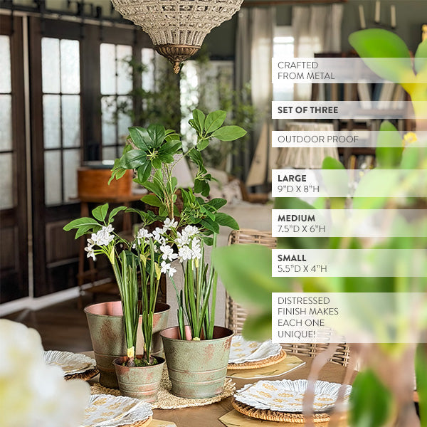 - Distressed verdigris patina gives each planter one-of-a-kind vintage character that only gets better with age