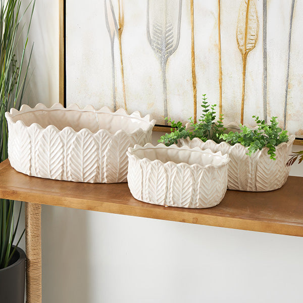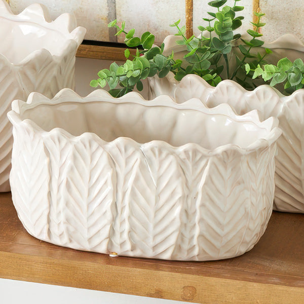 Each planter is shaped from ceramic and finished with a meticulous gloss polish that gives it that clean, high-end look. The embossed leaf pattern running along the exterior adds just the right amount of texture — classic and botanical, without being overdone. The scalloped ruffled rim is the cherry on top. It's the kind of detail that makes people ask "where did you get that?"
