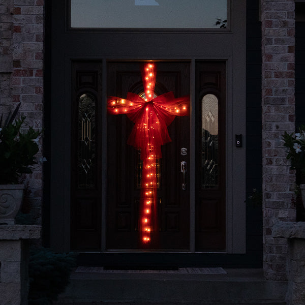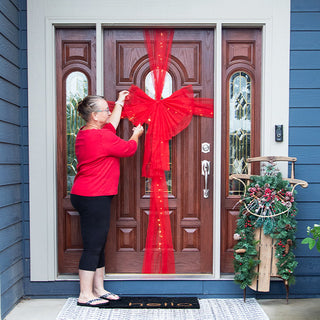 This stunning, illuminated decoration is designed to bring holiday cheer to your home and make a grand statement for all your visitors. Let your neighbors know how much you love Christmas and spread cheer throughout the season with this eye-catching Oversized LED Door Bow that radiates holiday spirit.