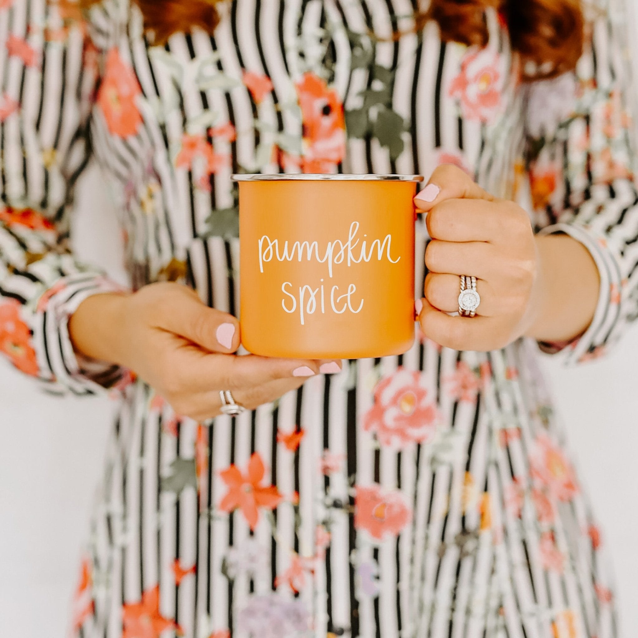 Say hello to crisp air, your favorite warm fall drinks, and comfy sweaters with our Pumpkin Spice Campfire Coffee Mug! PSL's have never tasted better! Our orange enamelware campfire mug can hold up to 18oz of your favorite fall beverage and is a perfect way to cozy up and enjoy the chilly season! #PSL