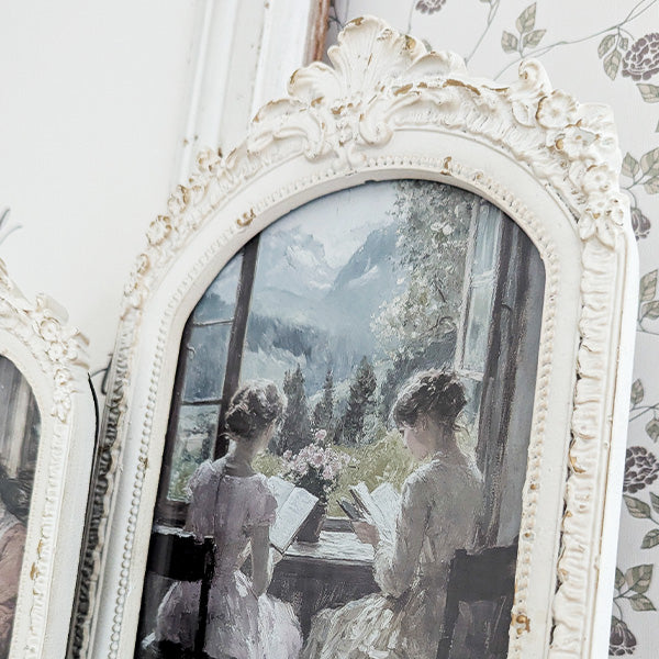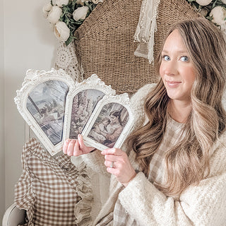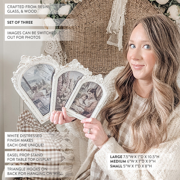 When nostalgia meets farmhouse charm, it's a match made in heaven. This set of three distressed white ornate picture frames blends vintage elegance with rustic appeal, making it the perfect addition to your farmhouse decor. Featuring soft, timeless artwork, these frames beautifully capture moments of warmth and serenity—but the best part? The images can be switched out for your own cherished photos, making them truly personal.