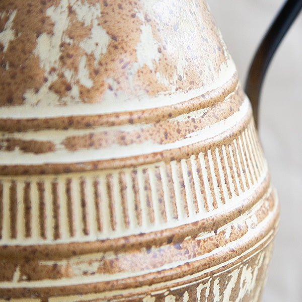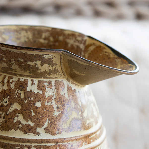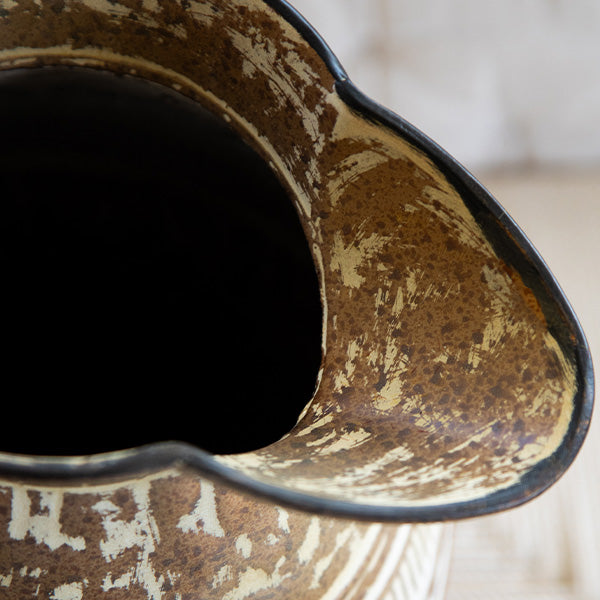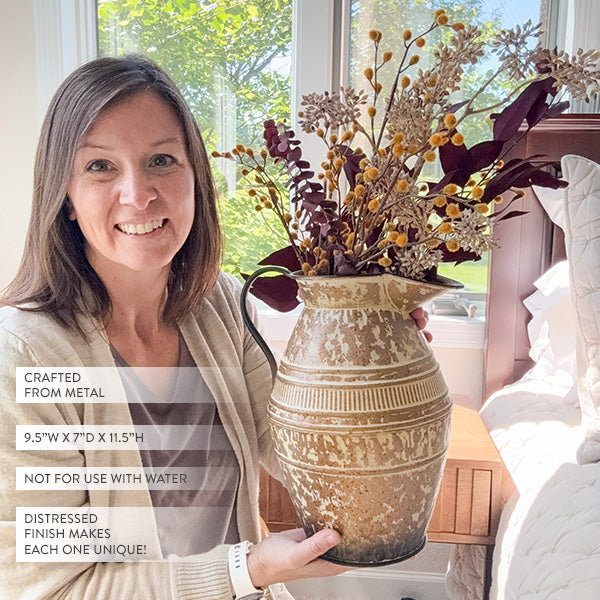 Introducing our gorgeous Aged Rustic Metal Pitcher! This vase is like living art with its perfectly distressed, and rustic metal texture, it brings an authenticity and character that can't be found in modern pieces. Every chip, every mark, tells a story and makes it completely unique to you. The classic pitcher shape adds a touch of timeless charm that feels both elegant and down-to-earth.
