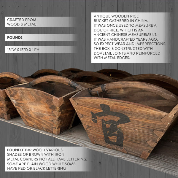 Some buckets are beautifully plain, highlighting the warm variations of natural wood, while others display red or black hand-painted Chinese lettering, once used to mark owners or contents. Every single one is unique, a one-of-a-kind relic salvaged just for you.