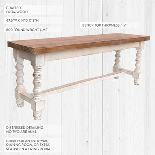 - Farmhouse Bench is beautifully crafted from wood with distressed detailing