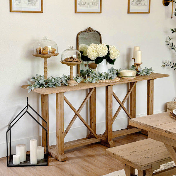 Crafted from sturdy fir wood with a natural finish, this beauty features that timeless X-frame base we all SWOON over. At over 70" long, it’s the perfect size to anchor your entryway, living room, or dining space with style. Whether you’re styling it with stacked books, baskets, or seasonal décor, its clean lines and rustic charm make it endlessly versatile.