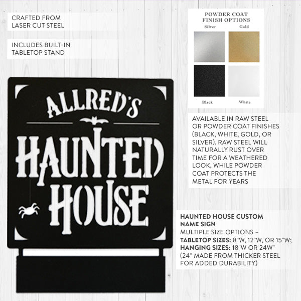 Make your Halloween display frightfully personal with our Haunted House Custom Name Sign. Available in three tabletop sizes (8", 12", or 15") and two hanging options (18" or 24"), this square-shaped sign features a fun, scary font and spooky cutout details, including a bat and spider. The top line is customized with your chosen name (preferably a last name) followed by “Haunted House.” Simply include the apostrophe “s” in your name when ordering for the perfect haunted home touch.
