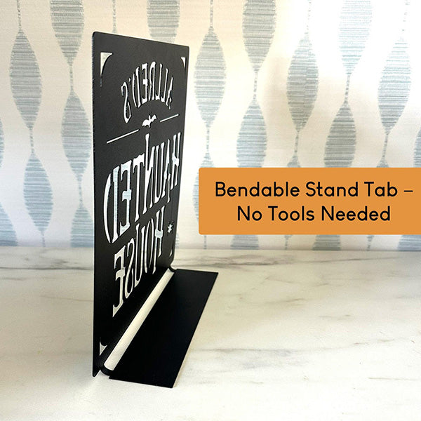 The tabletop version ships flat with a bendable tab for easy standing, while the hanging styles are designed for front doors, porches, or walls. For added durability, the 24" hanging style is cut from thicker gauge steel.