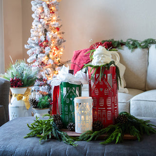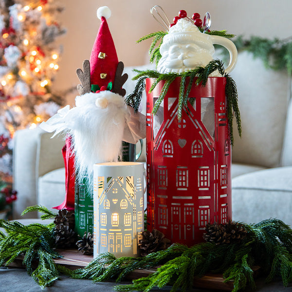 This set of three metal lanterns tells a story. Each one features an intricate village house design with laser-cut windows, doors, and charming heart details that cast the most beautiful warm glow when you add a candle inside. The large lantern stands bold in festive red (13-18"H), the medium brings classic green energy (9.5-13.5"H), and the small adds a crisp white accent (6.5-9.5"H). Together, they create a dimensional display that looks like you've been curating it for years.