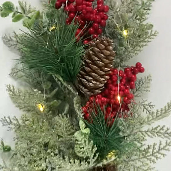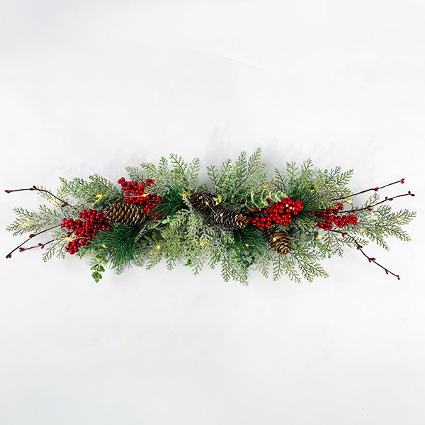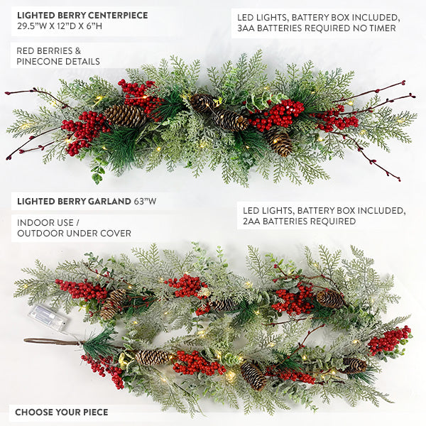 - Lighted Berry Garland: LED lights, battery box included, 2AA batteries required