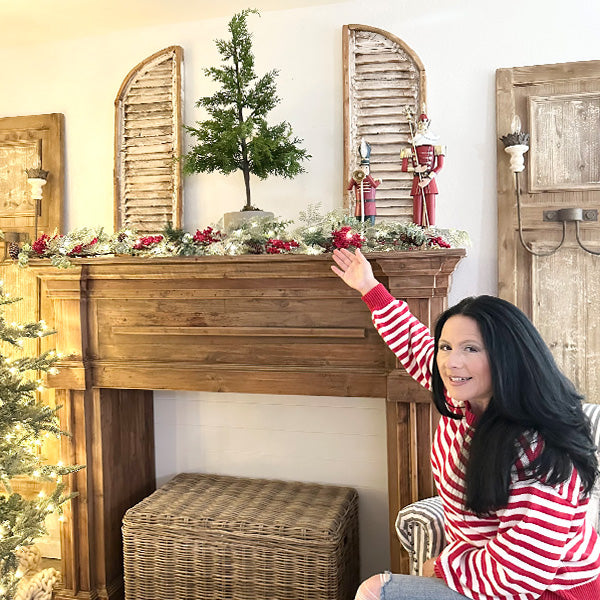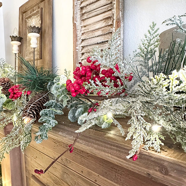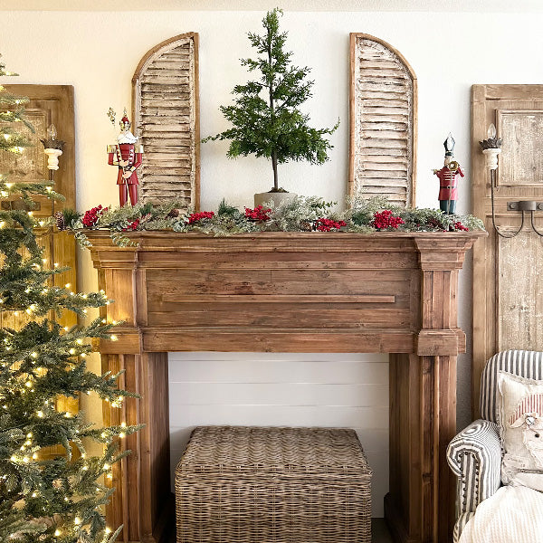 Lush evergreen, glowing LED lights, vibrant red berries, rustic pinecones. Your mantel or your table—you choose.