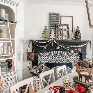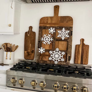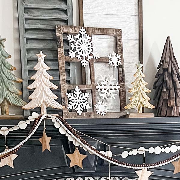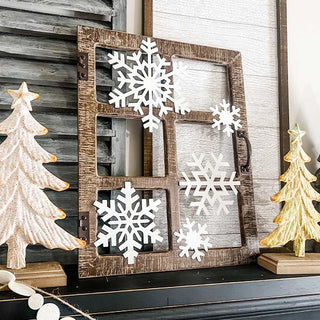 Hang OR lean this window frame above your mantel, near your Christmas tree, in your entryway or even your living room and create a super cozy atmosphere. The distressed wood of this frame will create interest and charm, while the metal stamped snowflakes spark the magic of Christmas and a twinkle in your eye!