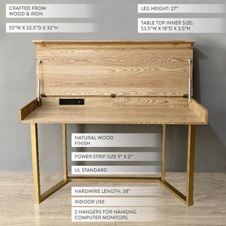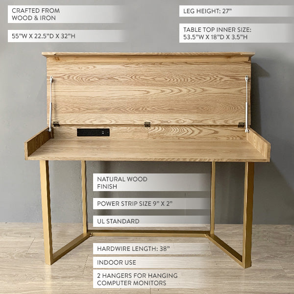 Does your table do this?! Meet the ultimate furniture chameleon—our 55-inch transforming wood table to desk that goes from sleek table to full-on workspace faster than you can say "Zoom meeting emergency!" The gorgeous natural wood top with its hypnotic wood grain sits on a killer gold frame, giving you serious style points while hiding your work mess with its magical fold-down top. It’s got brains, beauty, and a few surprises tucked inside.