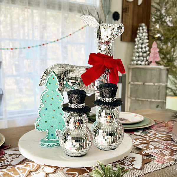 • Disco Ball Snowmen (Set of 2): 3.5"D x 7.5"H each, crafted from glass, styrofoam, & fabric with black glitter top hats