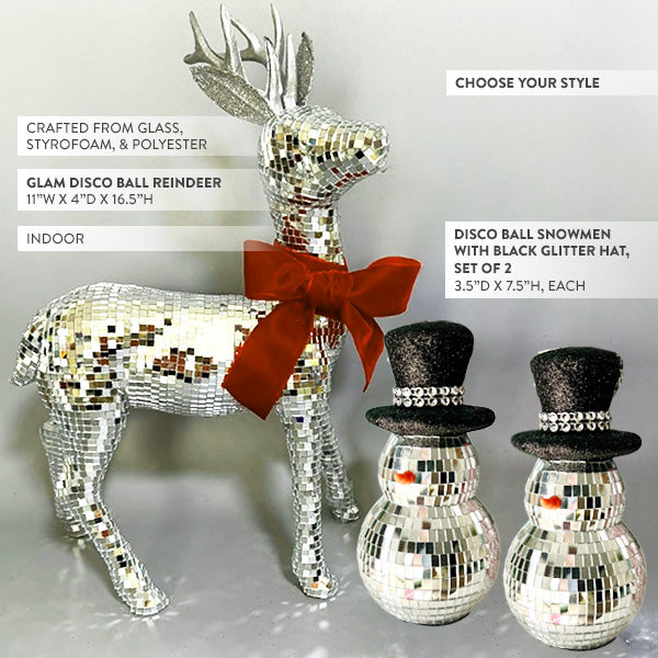 • Glam Disco Ball Reindeer: 11"W x 4"D x 16.5"H, crafted from glass, styrofoam, & polyester with red velvet bow