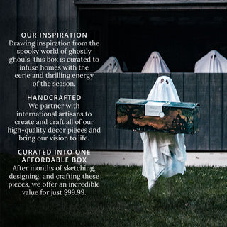 Each box is PACKED with ghoulish goodies that capture the magic of Halloween in a way that’s timeless, cozy, and oh-so-stylish. View the images for contents - a Ghastly Ghost, a Spooky Pre-lit Tree, a Set of Floating Candles, a Creepy Spider Bowl, and a Frightful Scroll Sign.
