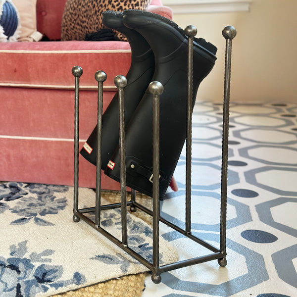 This distressed iron boot holder is the sophisticated solution your entryway has been begging for. Crafted from solid iron with a beautifully weathered black finish, each rack features unique distressed details that make it genuinely one-of-a-kind. The kind of piece that makes guests ask "where did you find that?"