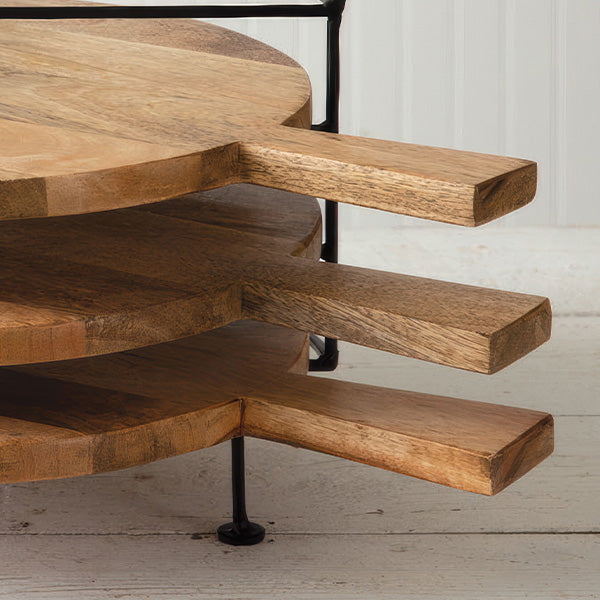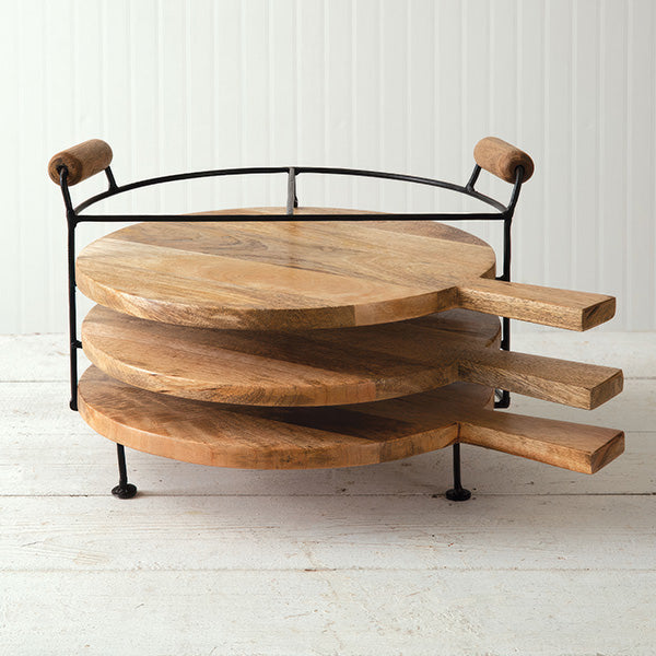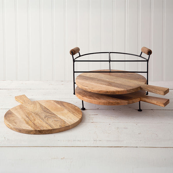 Add style to your farmhouse kitchen by displaying these beautiful cutting boards on your counter... ready to be used! The metal stand makes this steal oh so handy and oh so organized! These Round Wood Cutting Boards would also make such a beautiful display for your favorite candles or picture frames!