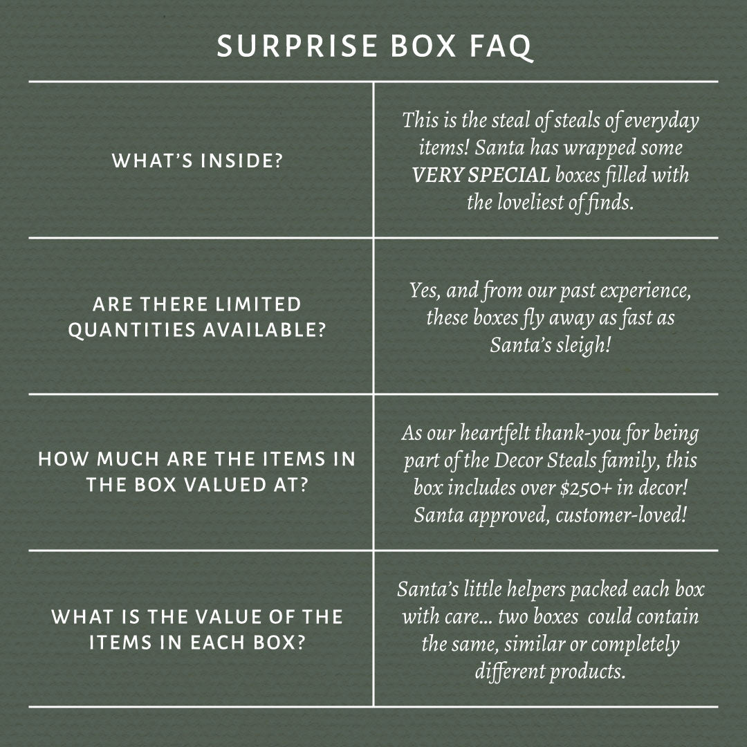 • HOW MUCH ARE THE ITEMS IN THE BOX VALUED AT? As our heartfelt thank-you for being part of the Decor Steals family, this box includes over $250+ in decor! Santa approved, customer-loved!