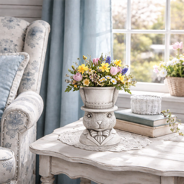 Most planters just sit there. This one has opinions. Dressed in a top hat and bow tie with an expression that says he's been expecting you, this dapper bunny planter is the kind of piece that stops people mid-step and makes them smile before they even notice what's growing in him.