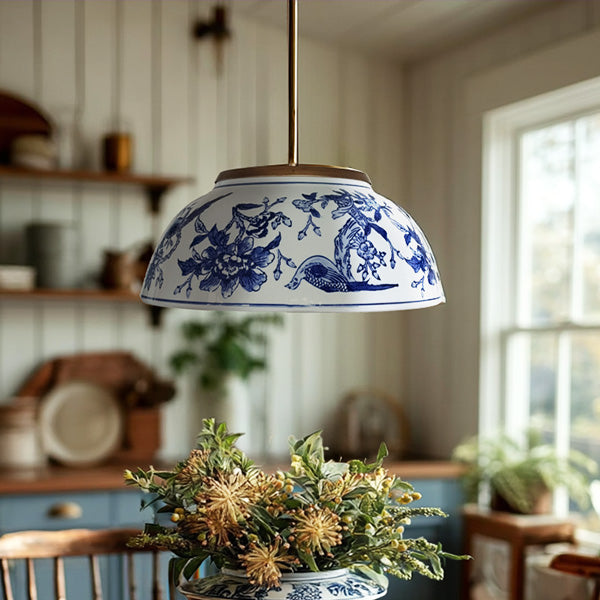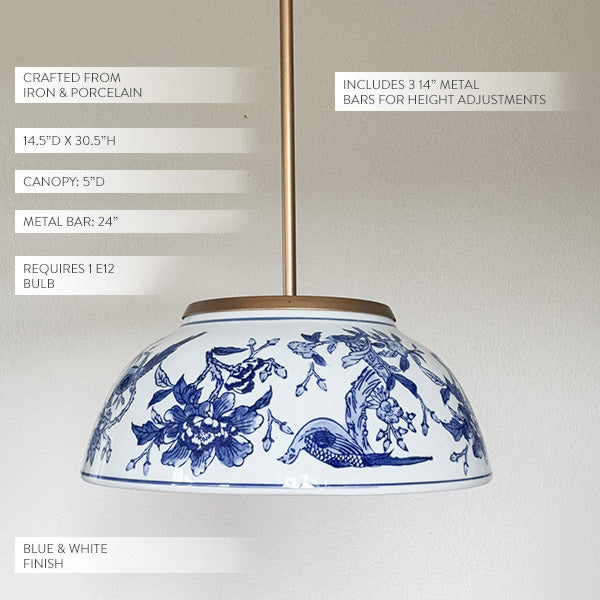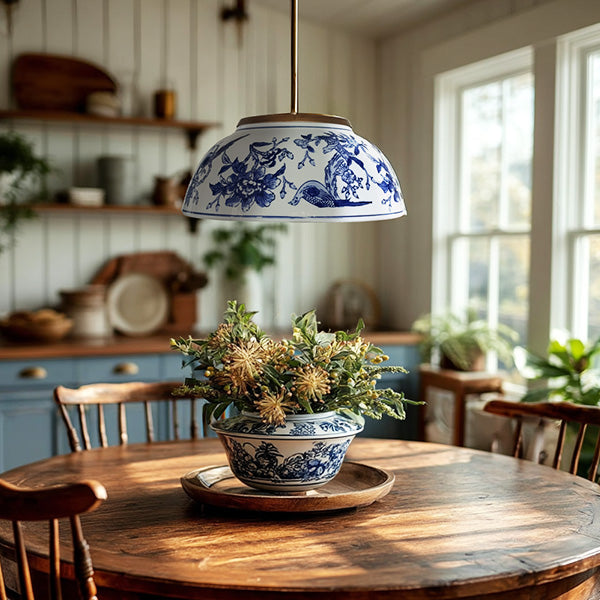 Introducing our breathtaking Grand Chinoiserie Rose Pendant Light! We are completely obsessed with this glamorous blend of classic elegance and modern style. The gorgeous porcelain shade features an intricate blue-and-white floral pattern, perfectly contrasted by a sleek brass metal rod. It’s the ultimate way to bring a touch of timeless, worldly sophistication into your farmhouse home.