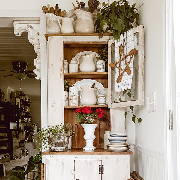 Distressed Finish: Soft white glaze with deliberate worn edges gives the look of a cherished antique.