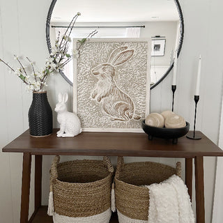 Our charming Curious Bunny Textured Metal Sign with Wood Frame is back by popular demand! Designed to infuse farmhouse-style warmth and timeless appeal into your home. Crafted with meticulous attention to detail, this delightful piece complements various design styles, effortlessly blending with farmhouse, rustic, and traditional themes.