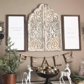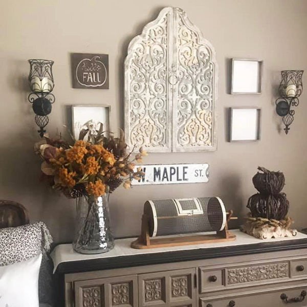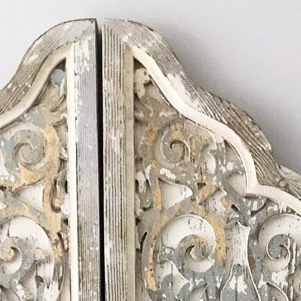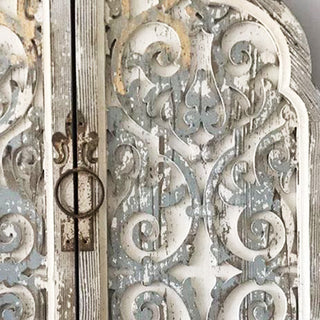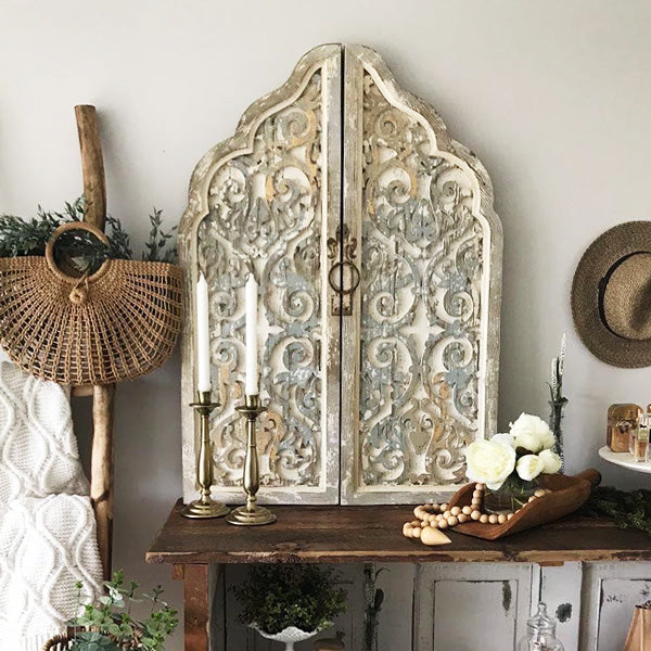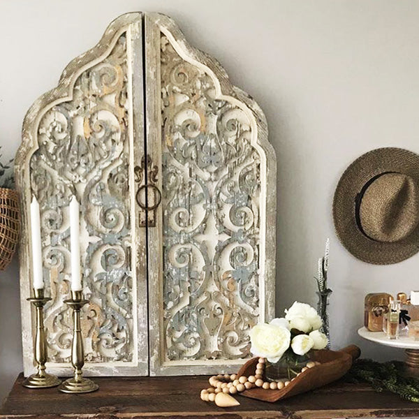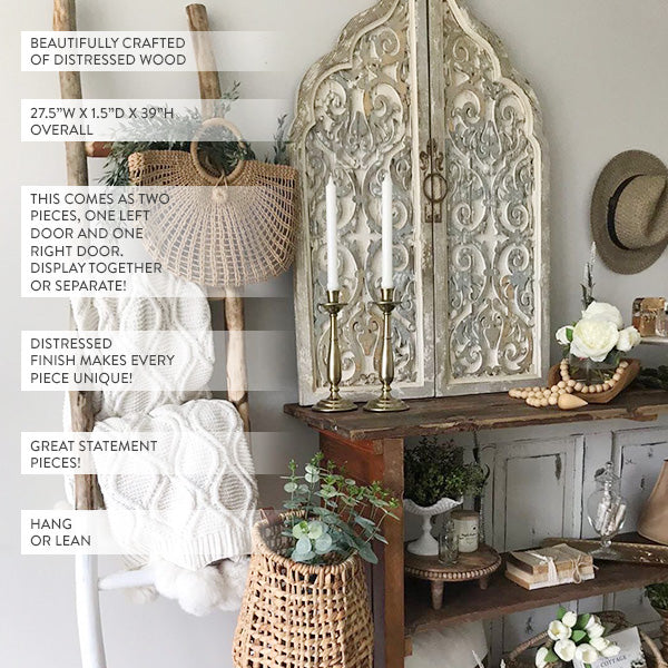 Is there anything prettier than these beautifully carved wooden doors? The elegance of the scrollwork paired with the perfectly distressed wood is a farmhouse dream! This intricately carved set of doors can be displayed together or apart, either way, the statement will be breathtaking.