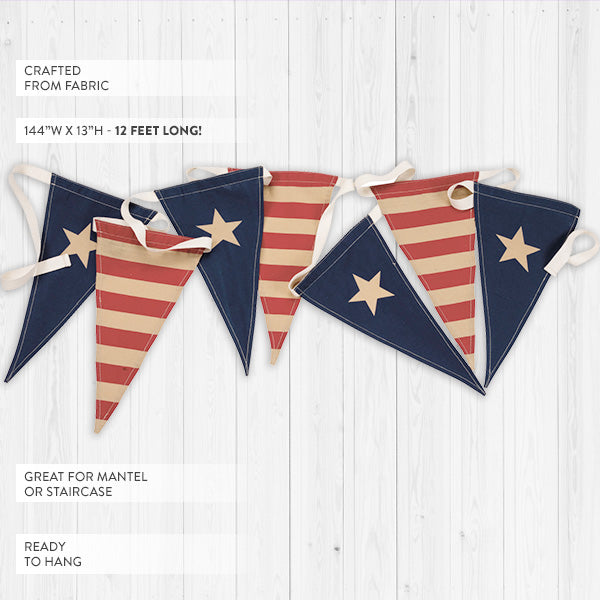 Whether it's President's Day, The Fourth of July, Memorial Day, Veterans Day OR just a regular Wednesday we are ALL proud to be Americans! So let's show that American Pride all year round with our beautiful 12 Foot Long Patriotic Pennant Banner!