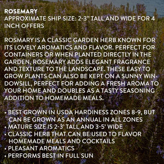 Rosmary is a classic garden herb known for its lovely aromatics and flavor. Perfect for containers or when planted directly in the garden, rosemary adds elegant fragrance and texture to the landscape. These easy to grow plants can also be kept on a sunny windowsill, perfect for adding a fresh aroma to your home and doubles as a tasty seasoning addition to homemade meals.