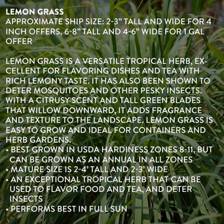 Lemon Grass is a versatile tropical herb, excellent for flavoring dishes and tea with rich lemony taste. It has also been shown to deter mosquitoes and other pesky insects. With a citrusy scent and tall green blades that willow downward, it adds fragrance and texture to the landscape. Lemon Grass is easy to grow and ideal for containers and herb gardens.