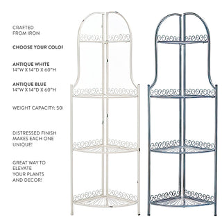 Introducing our versatile 4 Tier Distressed Iron Corner Shelf, a perfect blend of functionality and style for your farmhouse-inspired space. Available in two timeless hues: Navy Blue and Classic White, this corner shelf adds a touch of elegance while maximizing your storage options.