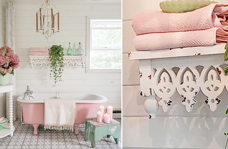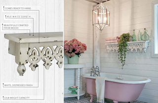 Whether you are drawn to the beautifully intricate scalloped edge or the distressed white chippy wood detail, this vintage-inspired wall shelf will add charm to any space!