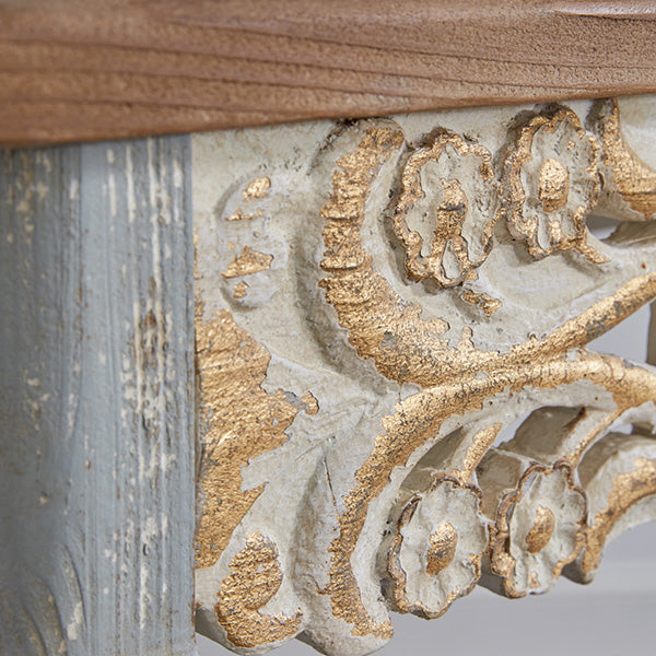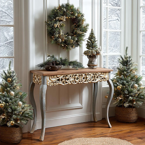 The distressed antique white base contrasts beautifully with the natural wood top, creating that two-tone sophistication that makes French country style so timeless. At just under 50 inches wide, it's substantial enough to make a real statement but won't overwhelm your space. And despite all that intricate carving, it's crafted from solid pine and fir—meaning this is built to last, not just look pretty.