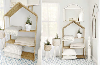 Imagine it in your bathroom housing your soaps, oils, perfumes, toiletries and maybe a potted plant. Or in the kitchen filled with spices, cookbooks your favorite tea set or utensils. Use it in your foyer as a bookshelf filled with succulents and charming accent pieces. How adorable would this seagrass shelving unit be in a child's room displaying their knick knacks and stuffed animals?!