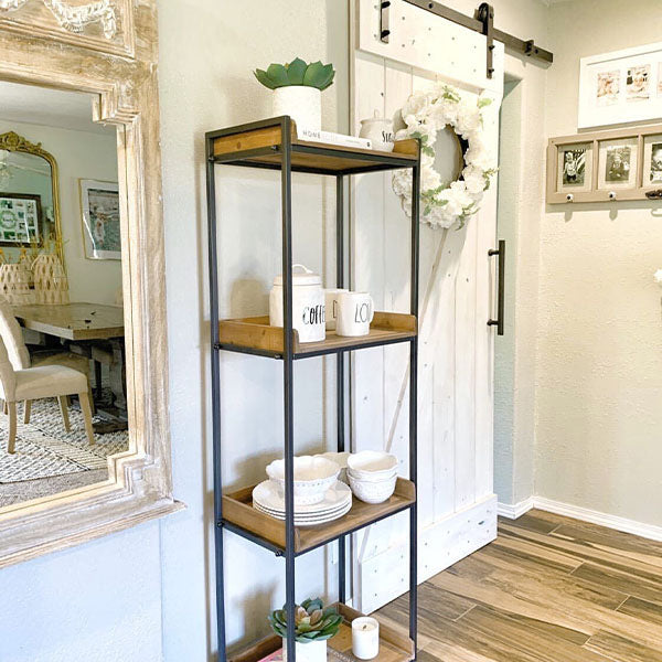 We LOVE that it has FOUR tiers... perfect for organizing! We're just SO excited thinking about ALL the different things you can do with this shelf unit! You can use it in your kitchen to hold your fruit and veggies, hold rolled-up dish towels, display coffee mugs and your seasonal plates! You could even use this ROLLING unit in your mudroom to hold your shoes OR in your craft room to hold ALL your craft supplies. We ADORE the idea of using this as a bookshelf and putting your favorite decorative pieces on it! The thought of filling it up with a ton of your favorite potted flowers and plants just makes our knees weak! The wheels make this piece SO versatile... easily move it from room to room!