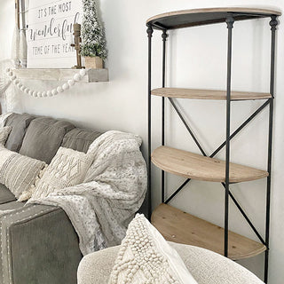 This HUGE shelving unit just exudes charm and personality and has LOADS of character with its unique shape! We can see this styled in your entryway to collect your hats, gloves, purses, bookbags, doggie leashes and doggie bags! This will be the PERFECT piece to keep all your toilet paper, rolled hand towels, Q-tips, magazines, lotions, and extra shampoo and conditioners in your bathroom! We can see this styled in your kitchen to hold your overflow of supplies! Who doesn't need extra kitchen storage?! Place this farmhouse shelving unit in your living room or dining room to hold your favorite small potted plants, books, remotes, and picture frames! You can’t go wrong wherever you style it! The rounded shape makes it the perfect size to go just about anywhere!