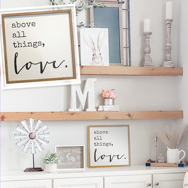 We cannot wait to see this GORGEOUS Above All Things Love Sign hanging high in YOUR home sweet home! Simply add it to your mantel, dining room or entryway for the perfect finishing touch OR make it the center of your gallery wall. It would also look ADORABLE on the wall over your breakfast nook or on your kitchen counter!!! We just LOVE it and know you will too!