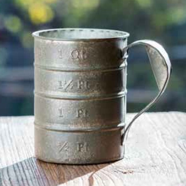 We are beyond excited to be able to bring you a kitchen necessity with a brand new twist! This aged metal 1-quart measuring cup is the PERFECT addition to your farmhouse decor and will make the cutest centerpiece planter or even supplies holder just about anywhere!