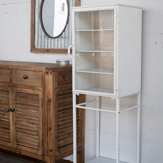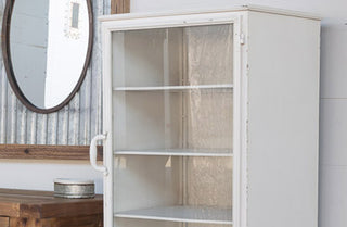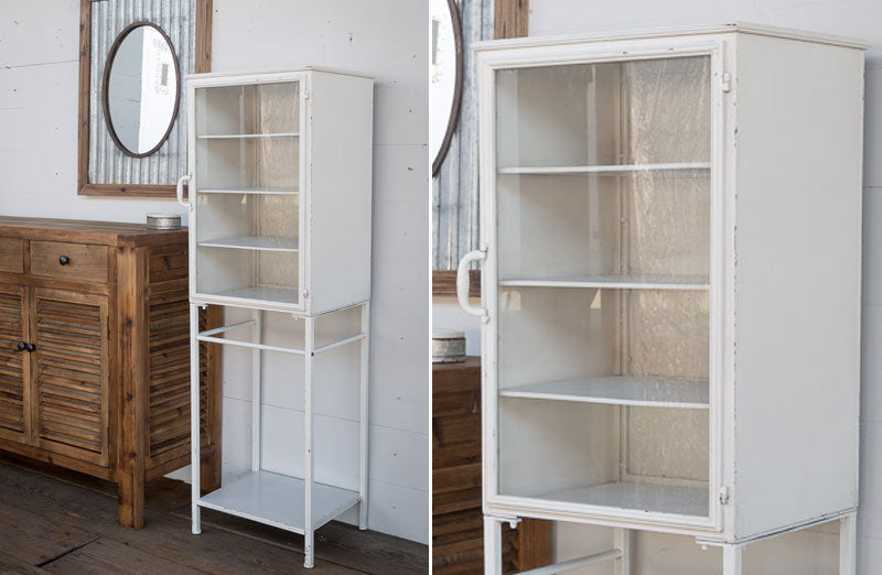 If you are like us vintage connoisseurs you will truly appreciate this distressed piece! We are absolutely in LOVE with the large size hand distressed white paint finish and the shape of the windows and of course the vintage inspired metal body. These seemingly old cabinets are classic beauties that will look stunning lined with photos old books statues flowers plants or even all of the above! They are the perfect spot for rolled hand towels or other bathroom and kitchen essentials.