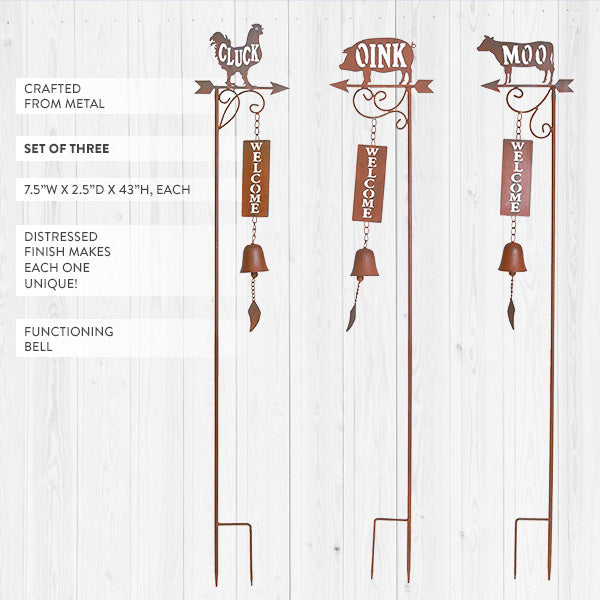 Add a touch of farmhouse charm to your yard with this Set of Three Metal Farm Animal Welcome Sign Yard Stakes! Perfect for greeting guests with rustic flair, each stake features a beloved farm animal silhouette perched atop a vertical "WELCOME" sign—complete with playful animal sound words. Whether placed along a walkway, in a garden, or by your porch, these signs bring warmth, whimsy, and a hint of barnyard fun to any outdoor space!